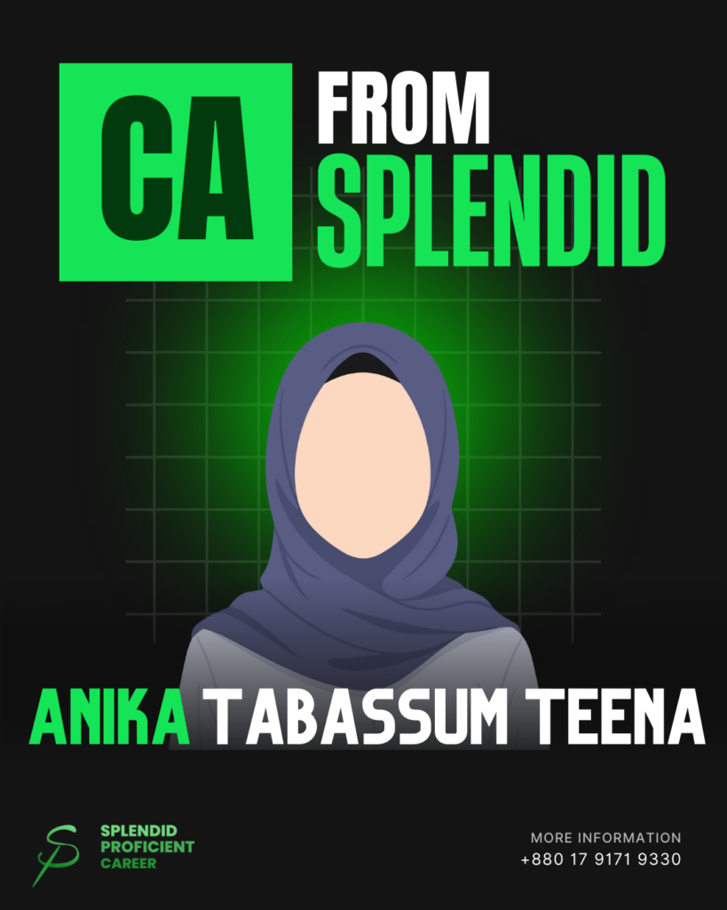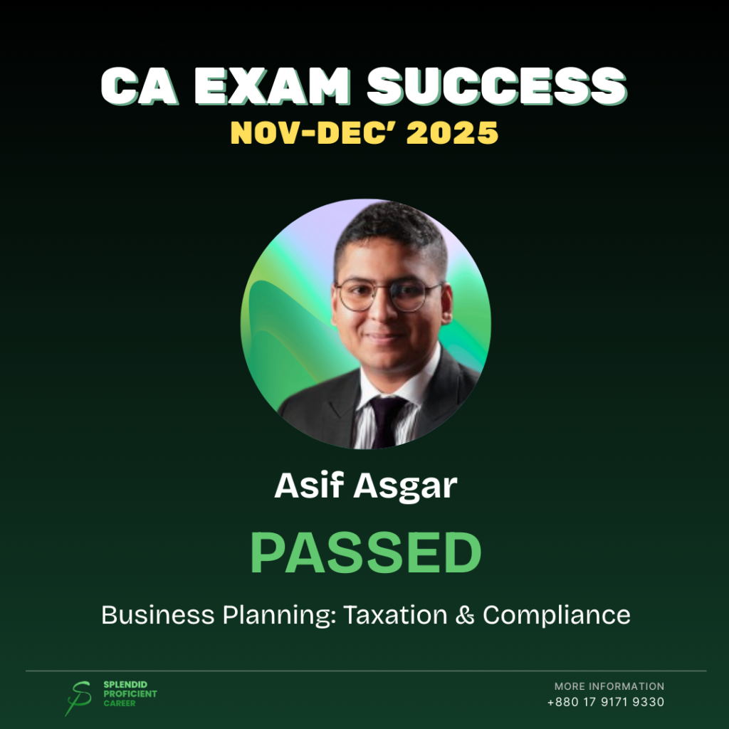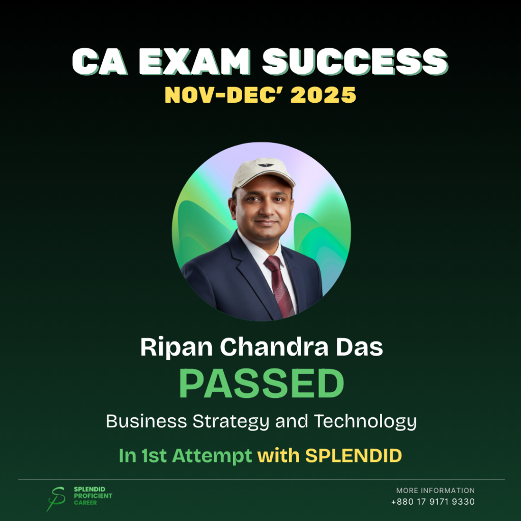 My CFO Sir guided me to take professional mentorship at Splendid Proficient Career, and that decision became a turning point in my CA journey. When I first joined Splendid, I was completely new to the CR exam standard preparation. Under the close mentorship of Mr. Kowser Bhuiyan FCA, Mr. Nazibullah FCA, and Mr. Shihab Bhai ACA, I received a structured, consistent, and highly effective guidance.